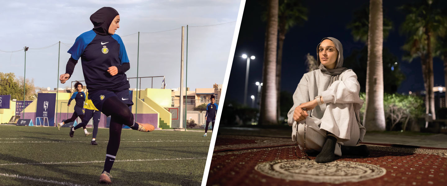 Boussaha practices in Khobar, Saudi Arabia (left). Away from the field: At a mosque in Khobar (right). Iman Al-Dabbagh/The New York Times