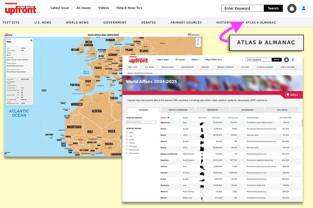 Every year, Upfront publishes an updated World Affairs Almanac & Atlas. This special issue is jam-packed with up-to-date information about the world’s 196 independent countries and the 50 U.S. states. Have students use it all year long as a handy reference tool and to think critically about the world around them. Watch this short video to learn more!
