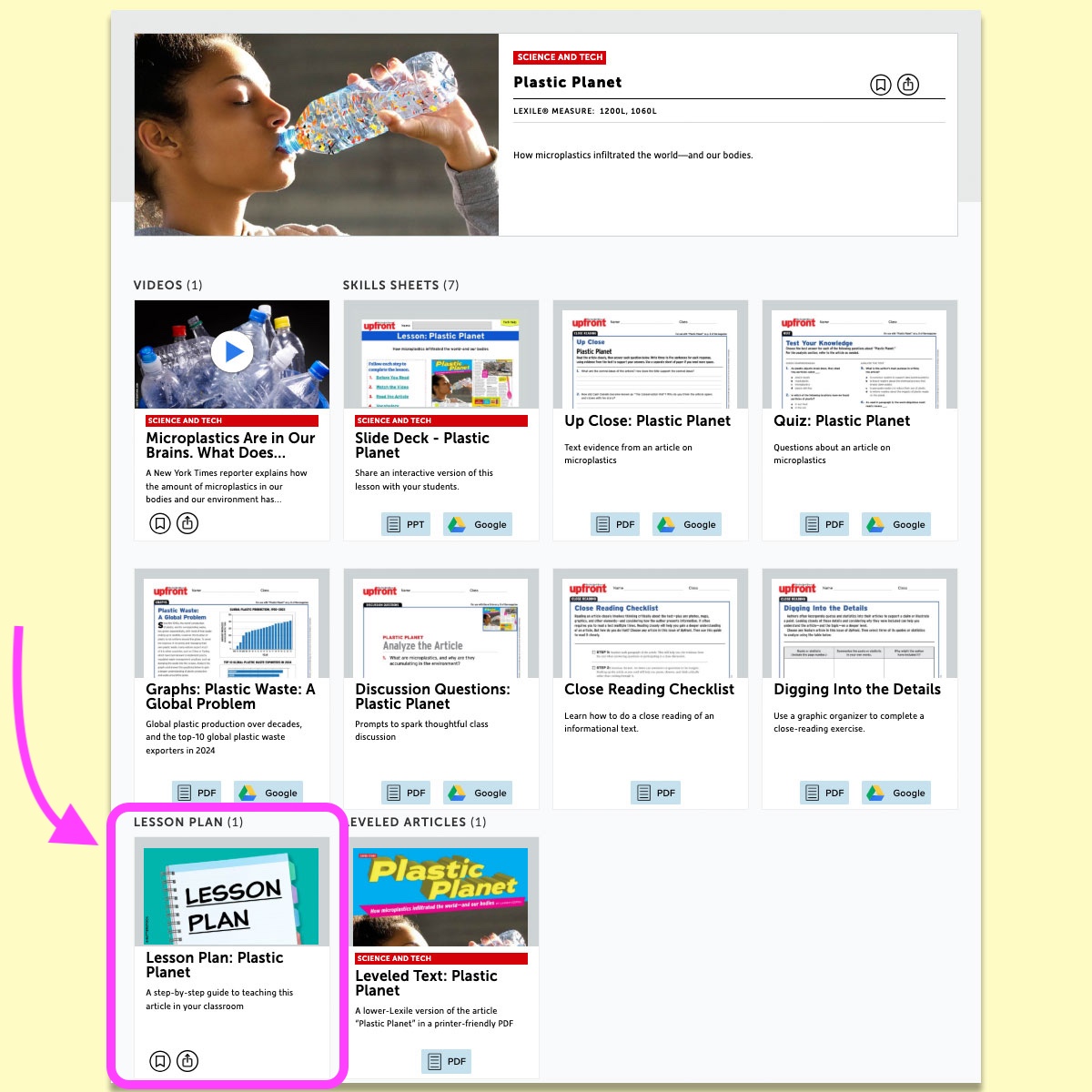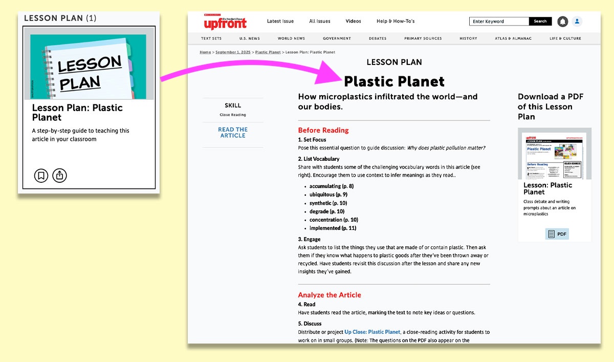 Every issue of Upfront comes with lesson plans that offer scaffolded instruction and pre-reading routines. They have discussion questions based on critical ELA skills and Extension activities that keep the learning going after students have read the article.
